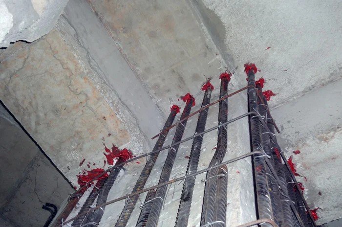 A protective process to clean, repair, and coat reinforcing steel (rebar) affected by corrosion. It prevents further rusting, restores bond strength with concrete, and extends the service life of the structure.
